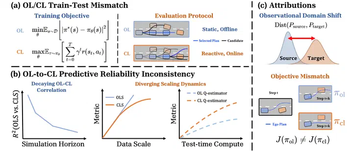 Open-loop (OL) to closed-loop (CL) gap (OL-CL gap) exists when OL-pretrained policies scoring high in OL evaluations fail to transfer effectively in closed-loop (CL) deployment. In this paper, we unveil the root causes of this systemic failure and propose a practical remedy. Specifically, we demonstrate that OL policies suffer from Observational Domain Shift and Objective Mismatch. We show that while the former is largely recoverable with adaptation techniques, the latter creates a structural inability to model complex reactive behaviors, which forms the primary OL-CL gap. We find that a wide range of OL policies learn a biased Q-value estimator that neglects both the reactive nature of CL simulations and the temporal awareness needed to reduce compounding errors. To this end, we propose a Test-Time Adaptation (TTA) framework that calibrates observational shift, reduces state-action biases, and enforces temporal consistency. Extensive experiments show that TTA effectively mitigates planning biases and yields superior scaling dynamics than its baseline counterparts. Furthermore, our analysis highlights the existence of blind spots in standard OL evaluation protocols that fail to capture the realities of closed-loop deployment.