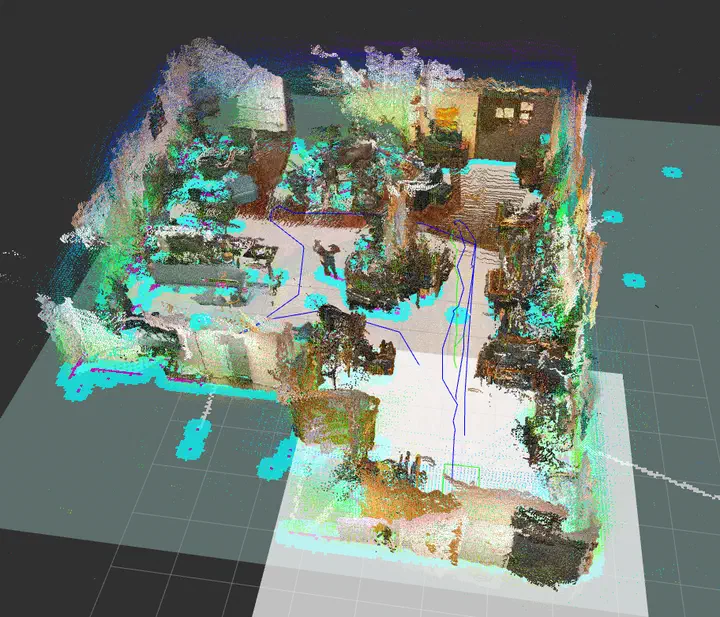 2D, 3D, and depth maps stacked on top of each other. The blue line is the odometry. The light blue pads are the global cost map surrounding the objects, and the white square box represents the local cost map